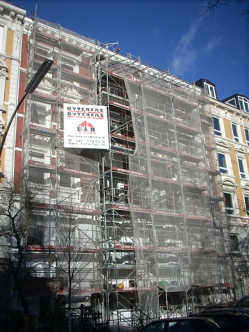 Die Fassade des Hauses wurde ebenfalls saniert. Zunächst wurden die Putz- und Stuckflächen mechanisch gereinigt. Anschließend wurden die Schadstellen im Bereich des Hauptgesimes, der Gurte und Fensterbekrönungen behoben. Vor Auftrag des Fassadenanstrichs wurde zu besseren Aufnahme und Verteilung von Rissdehnungen ein Kunststoffgewebe verklebt.